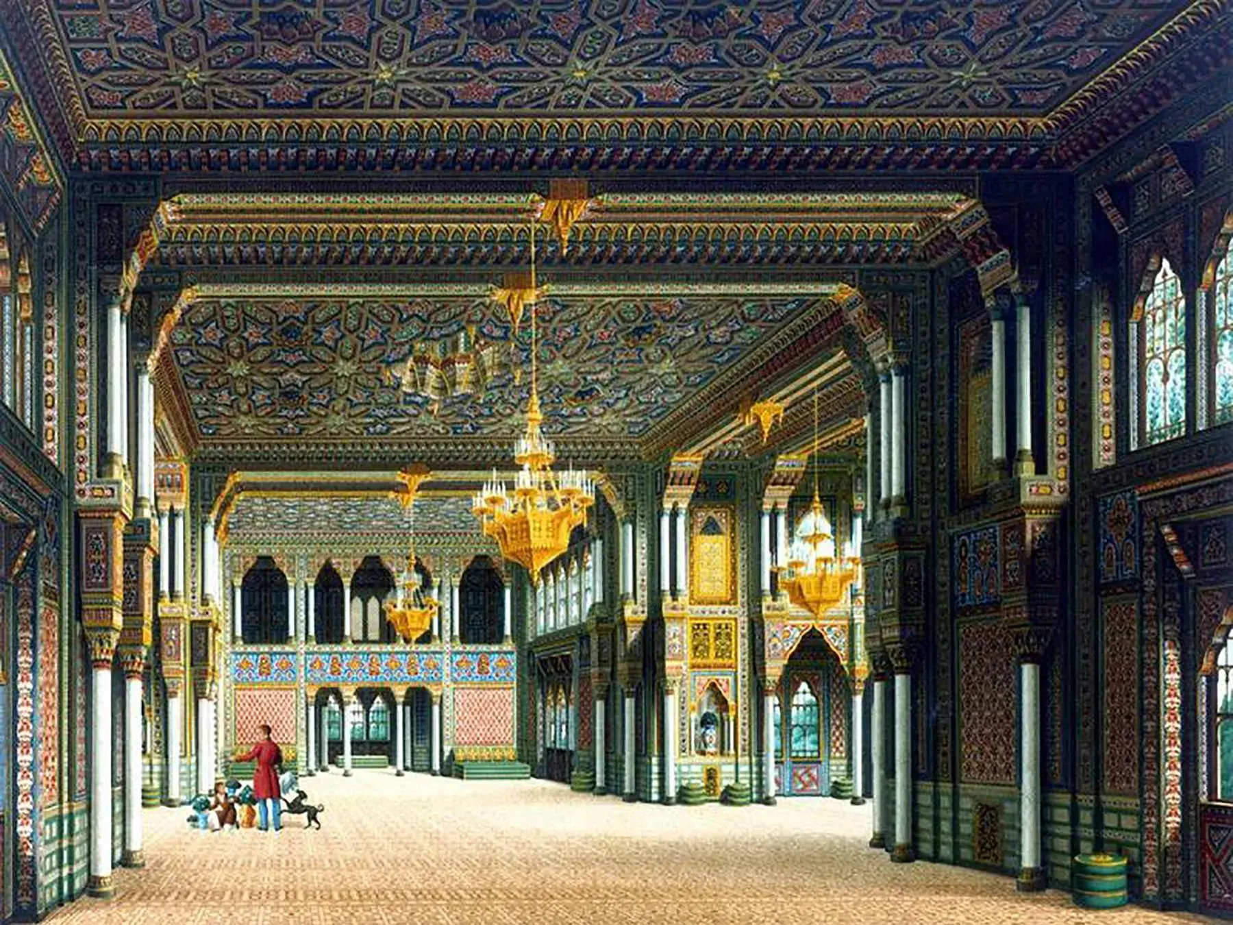 Der Entwurf zeigt den prächtigen Maurischen Festsaal, wie er bis 1944 bestand.