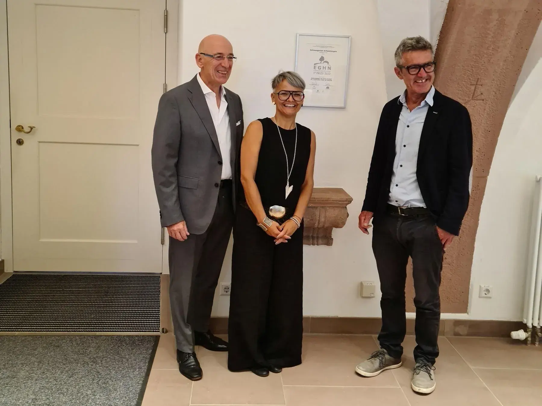 Alt Text: Schloss und Schlossgarten Schwetzingen, Michael Hörrmann, Geschäftsführer der Staatlichen Schlösser und Gärten Baden-Württemberg, und Prof. Dr. Hartmut Troll, Historische Gärten bei den Staatlichen Schlössern und Gärten Baden-Württemberg, sowie Sandra Moritz, die Leiterin der Schlossverwaltung Schwetzingen vor der EGHN-Urkunde